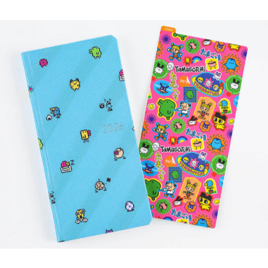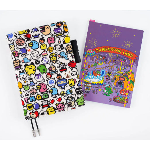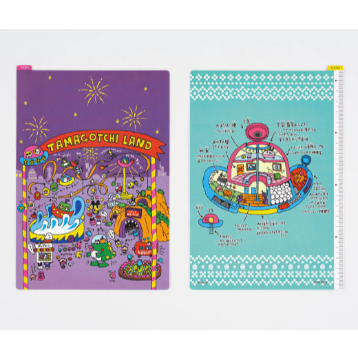The A5 size Tamagotchi Land is printed with an illustration of this theme park filled with the charm of the Tamagochi world from the 90’s. On the back, a Hyururun UFO is flying across a blue background.
