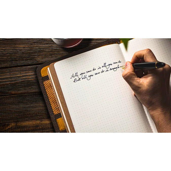 Fountain pen–friendly Tomoe River paper (68gsm) with a dot grid layout for an exceptional writing experience.
